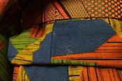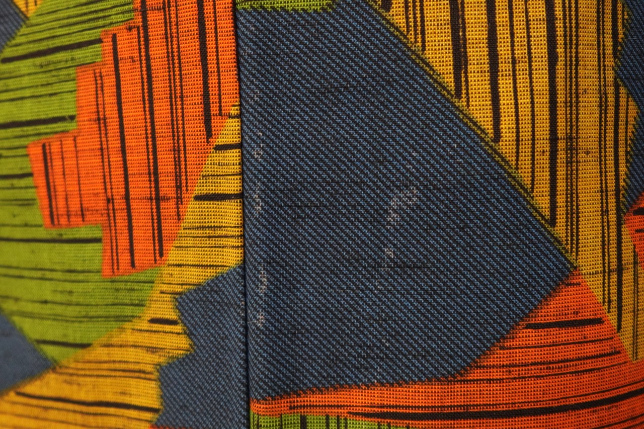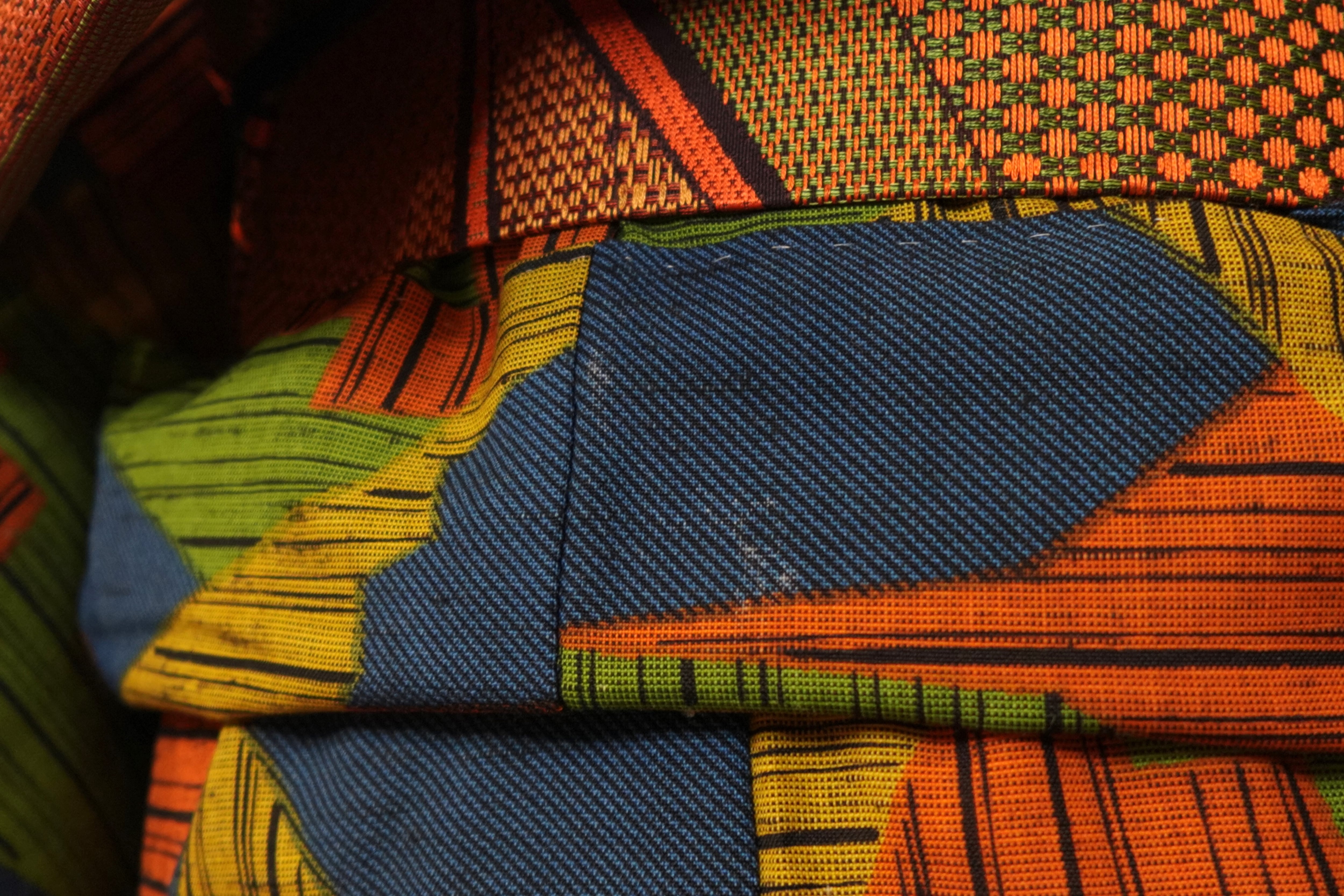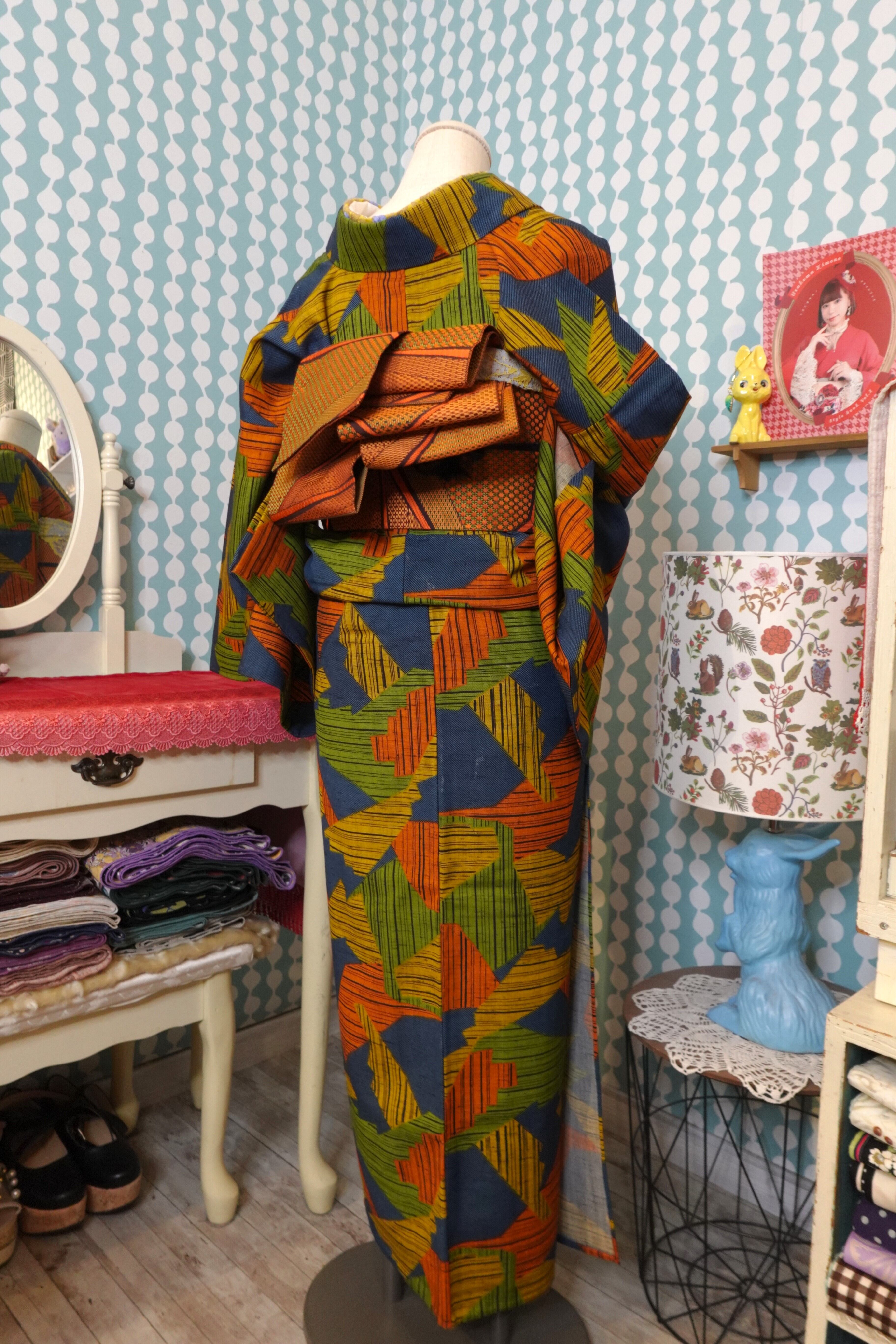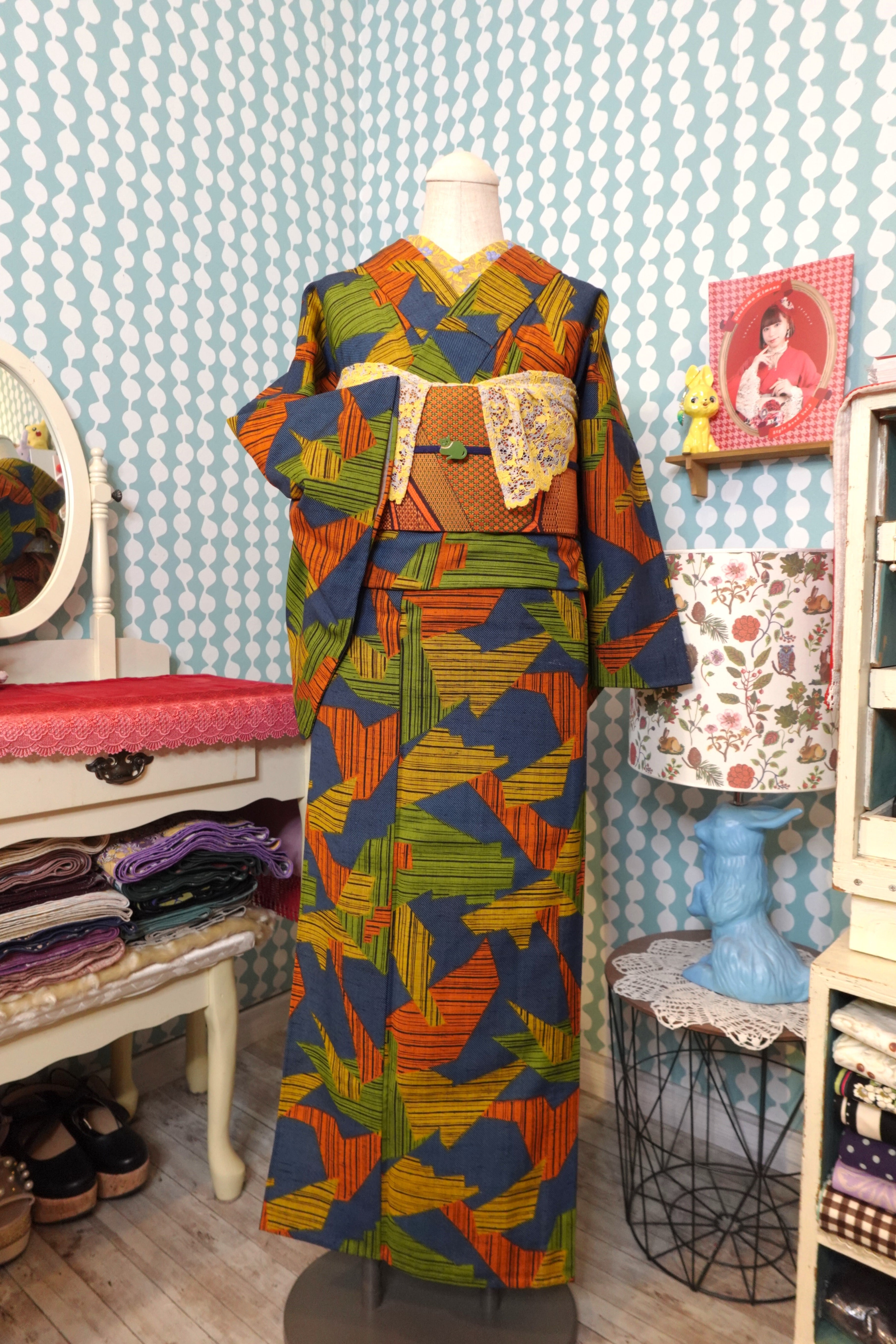 【身丈154cm】エスニックカラーのパズル柄ウール単衣着物【洗える着物】