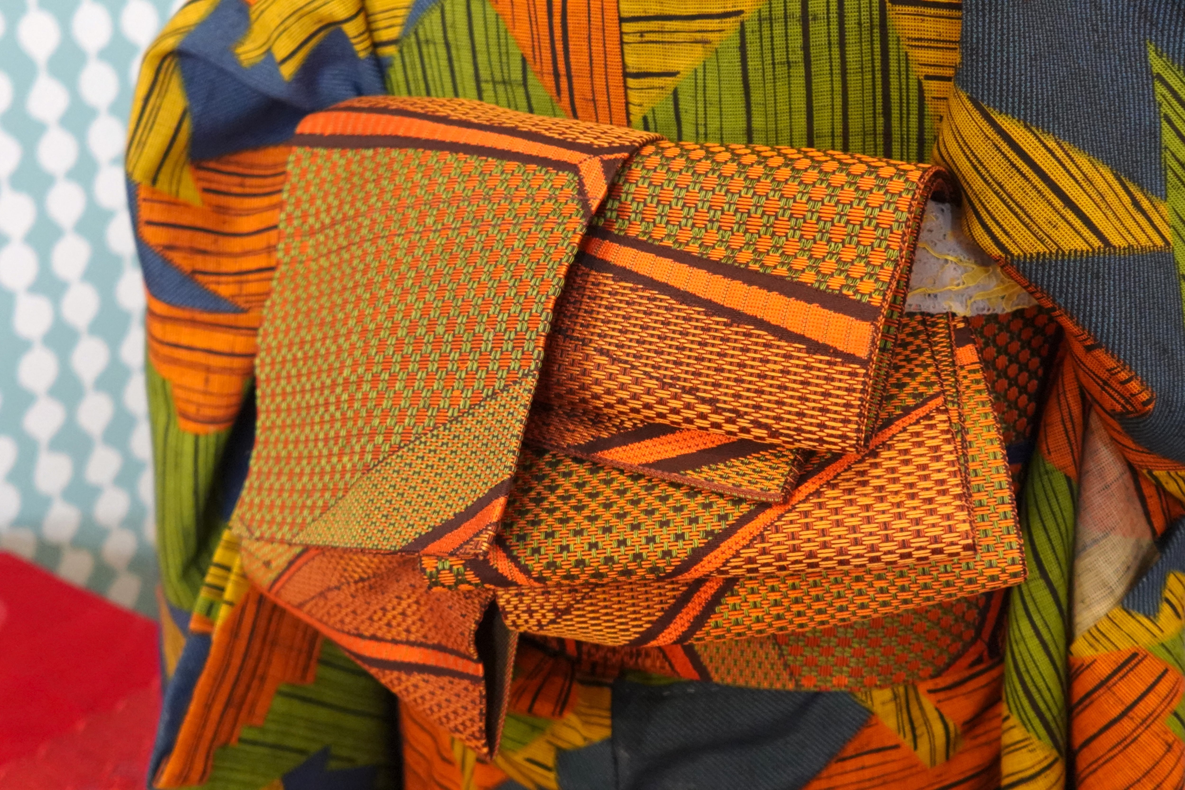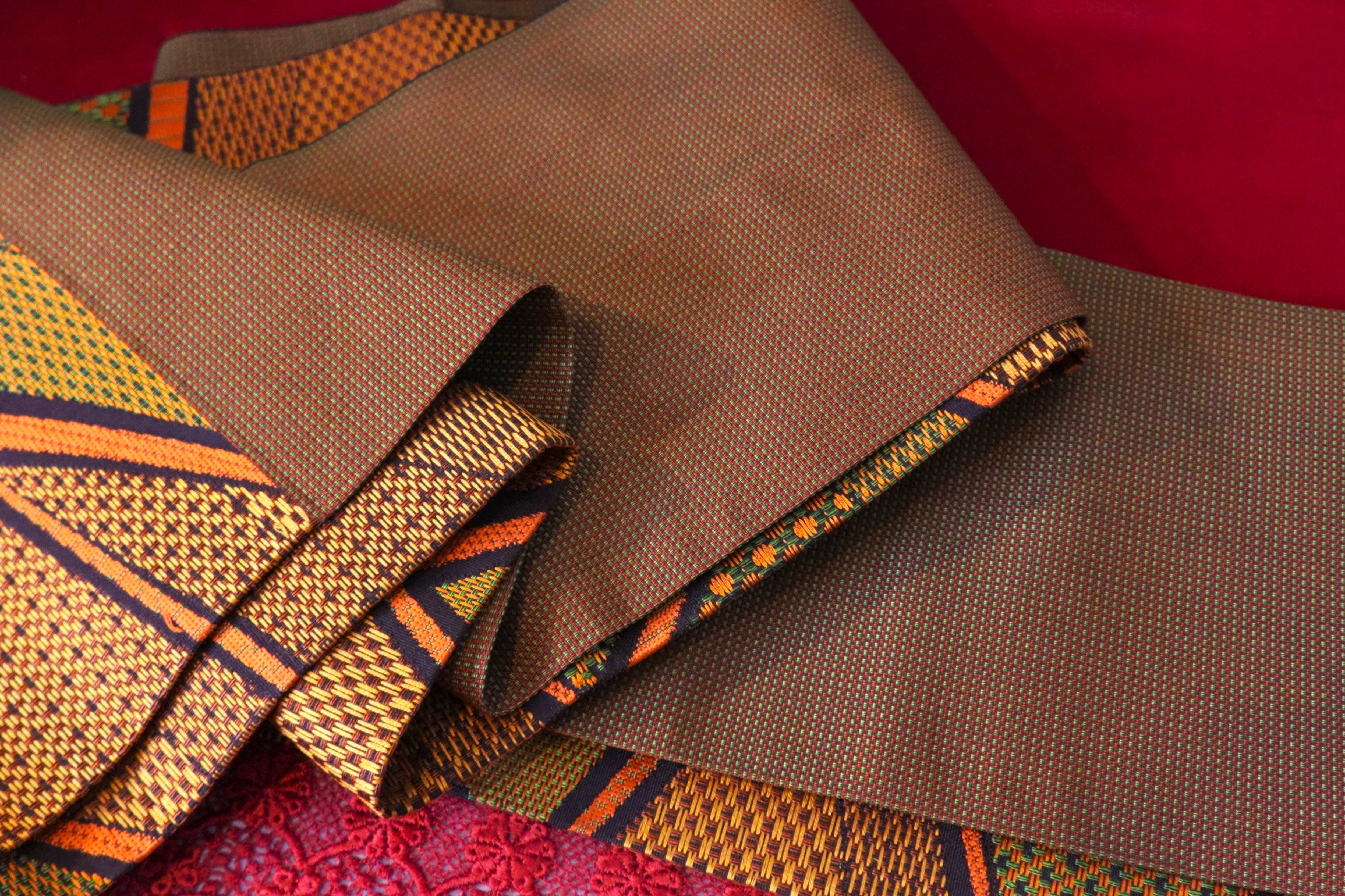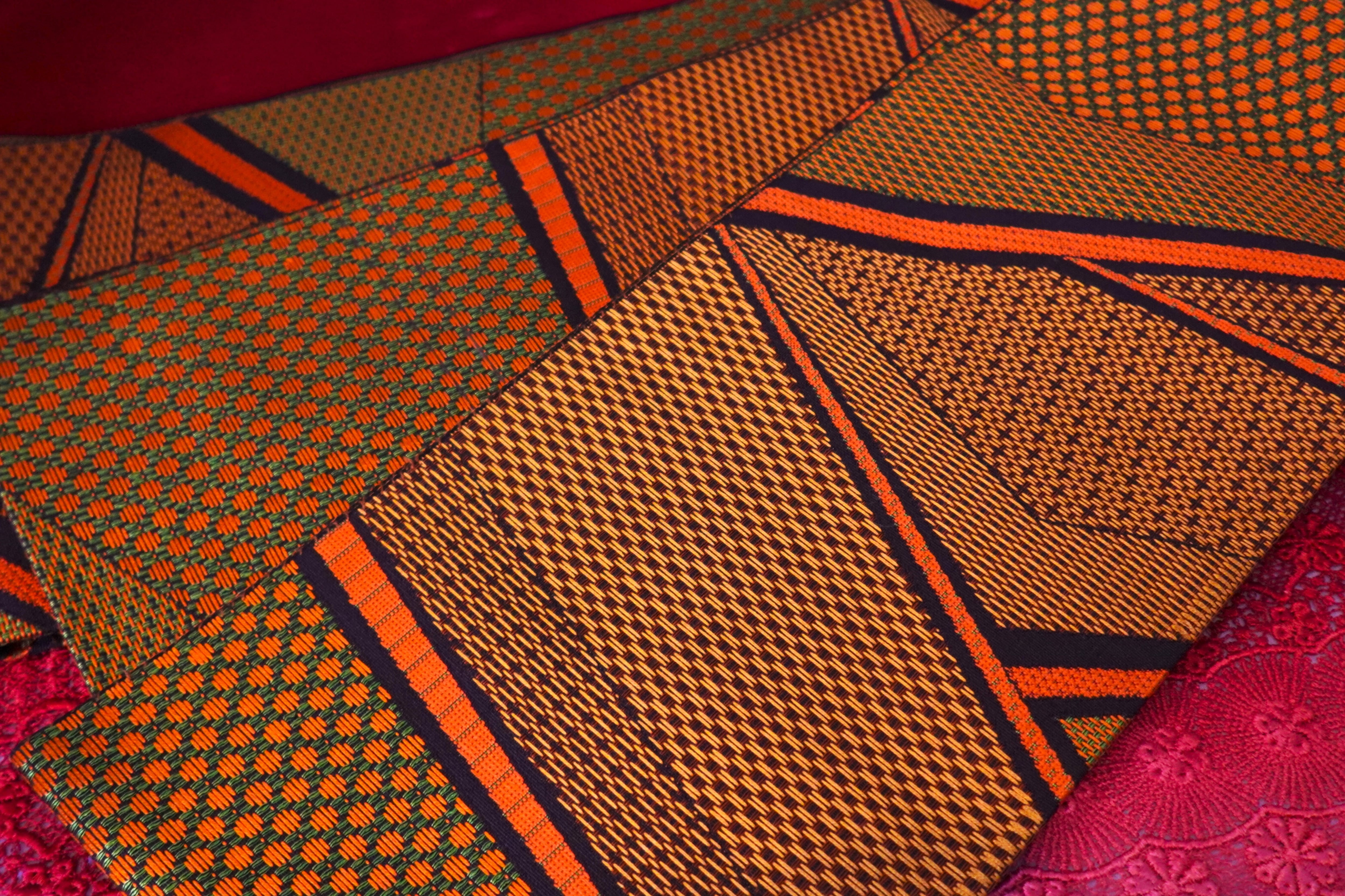 【354cm】オレンジブラウンの幾何学柄半幅帯
