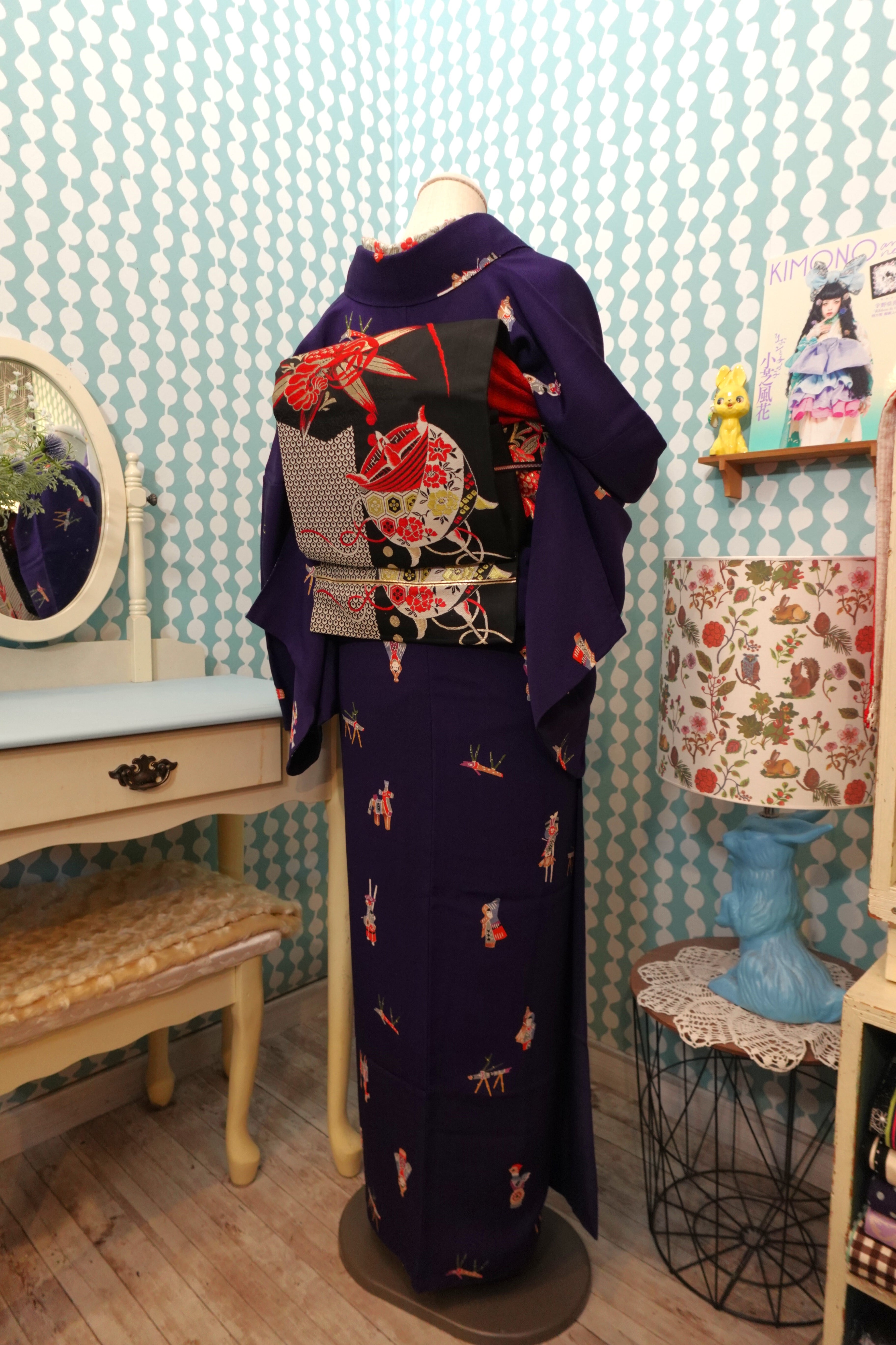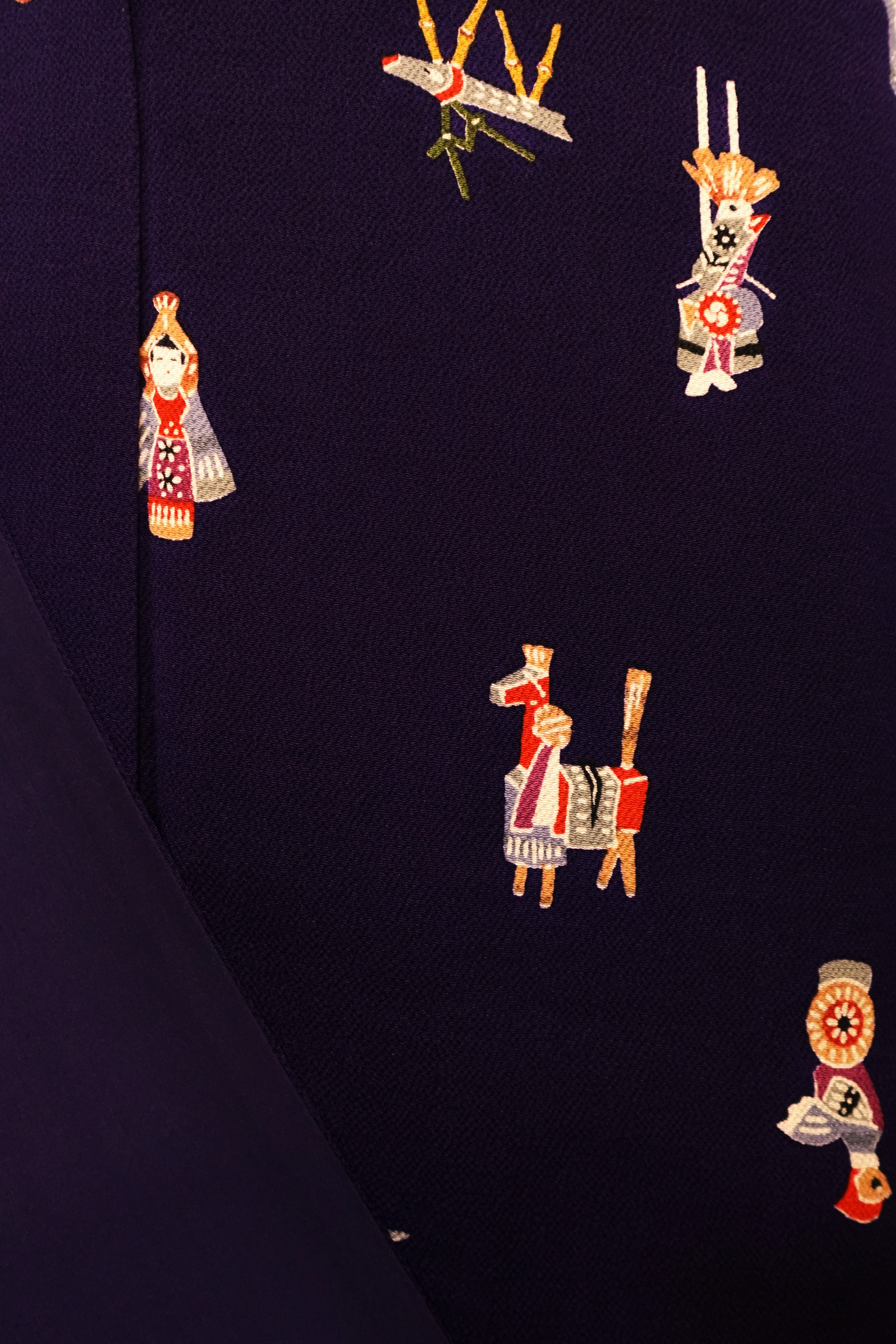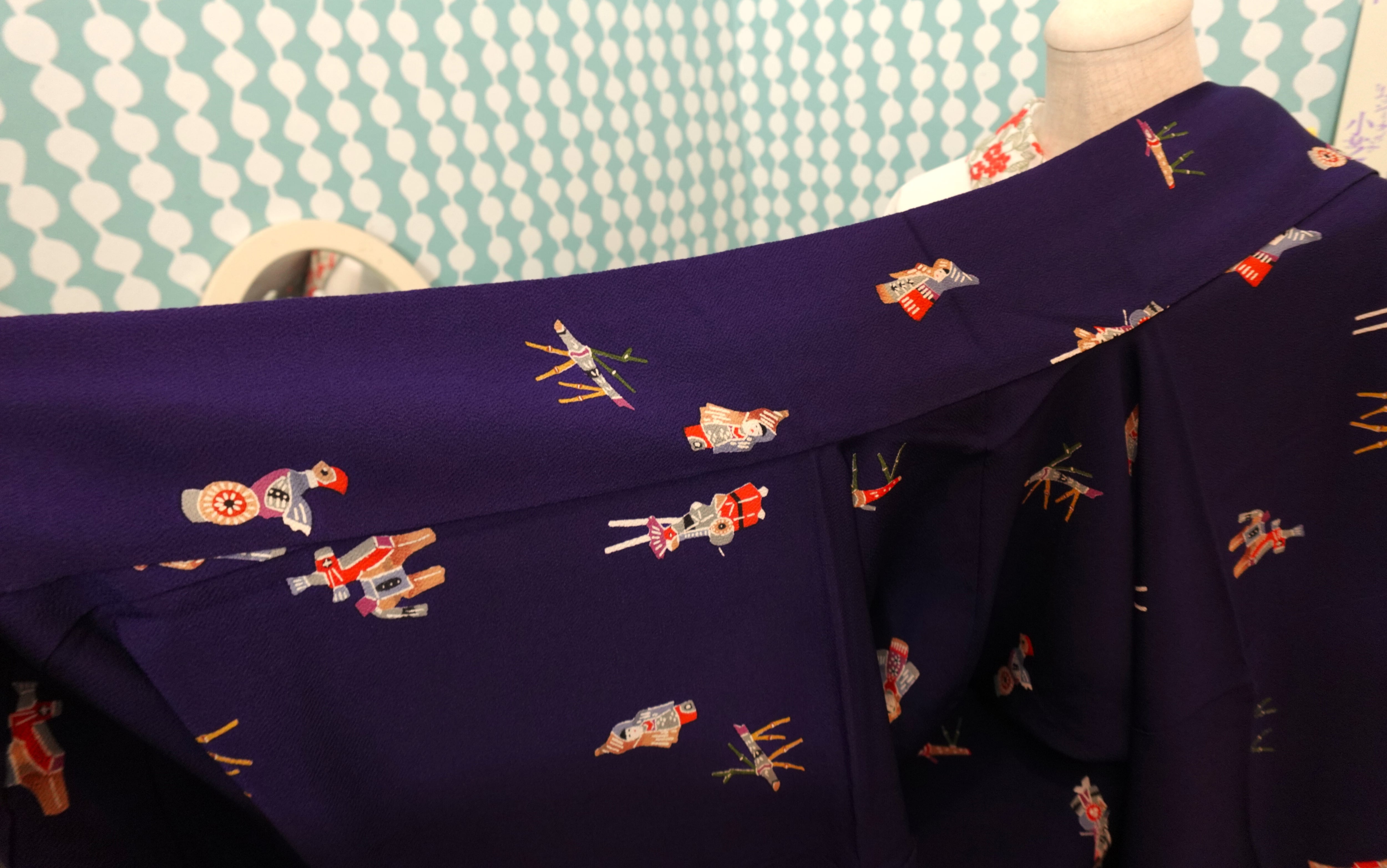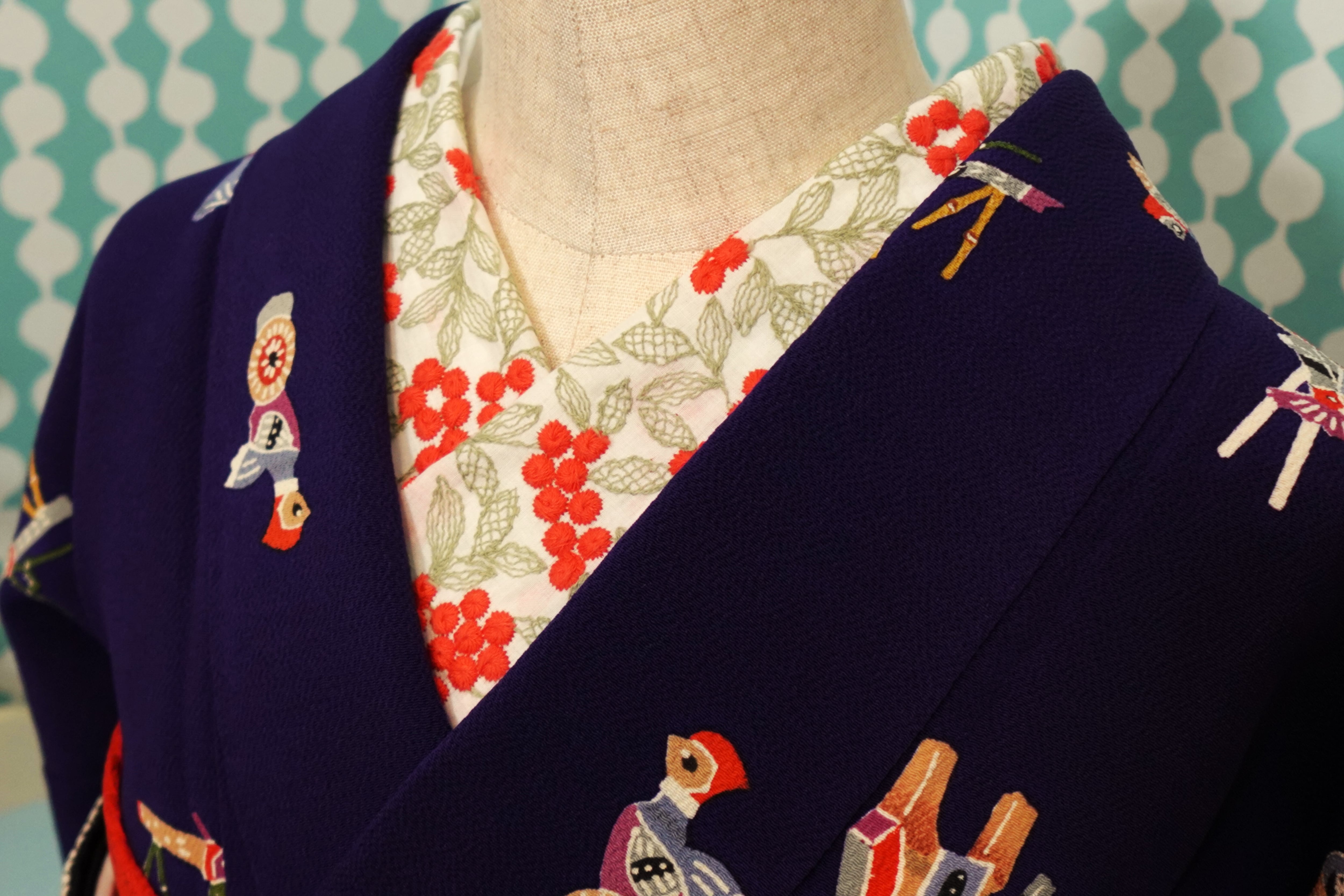 【身丈169cm】茄子紺に郷土玩具柄袷着物【小紋・裄丈長め】