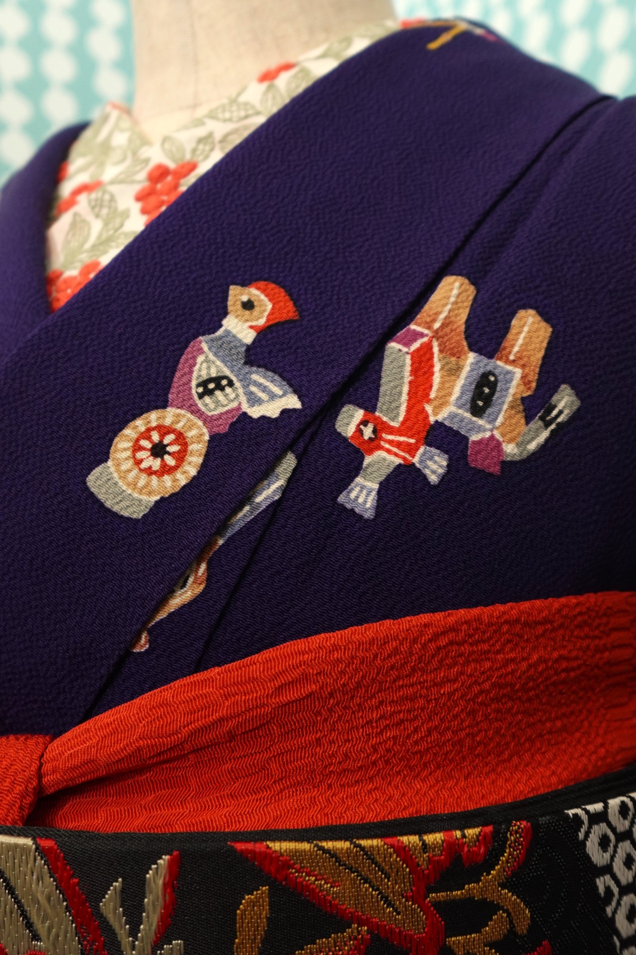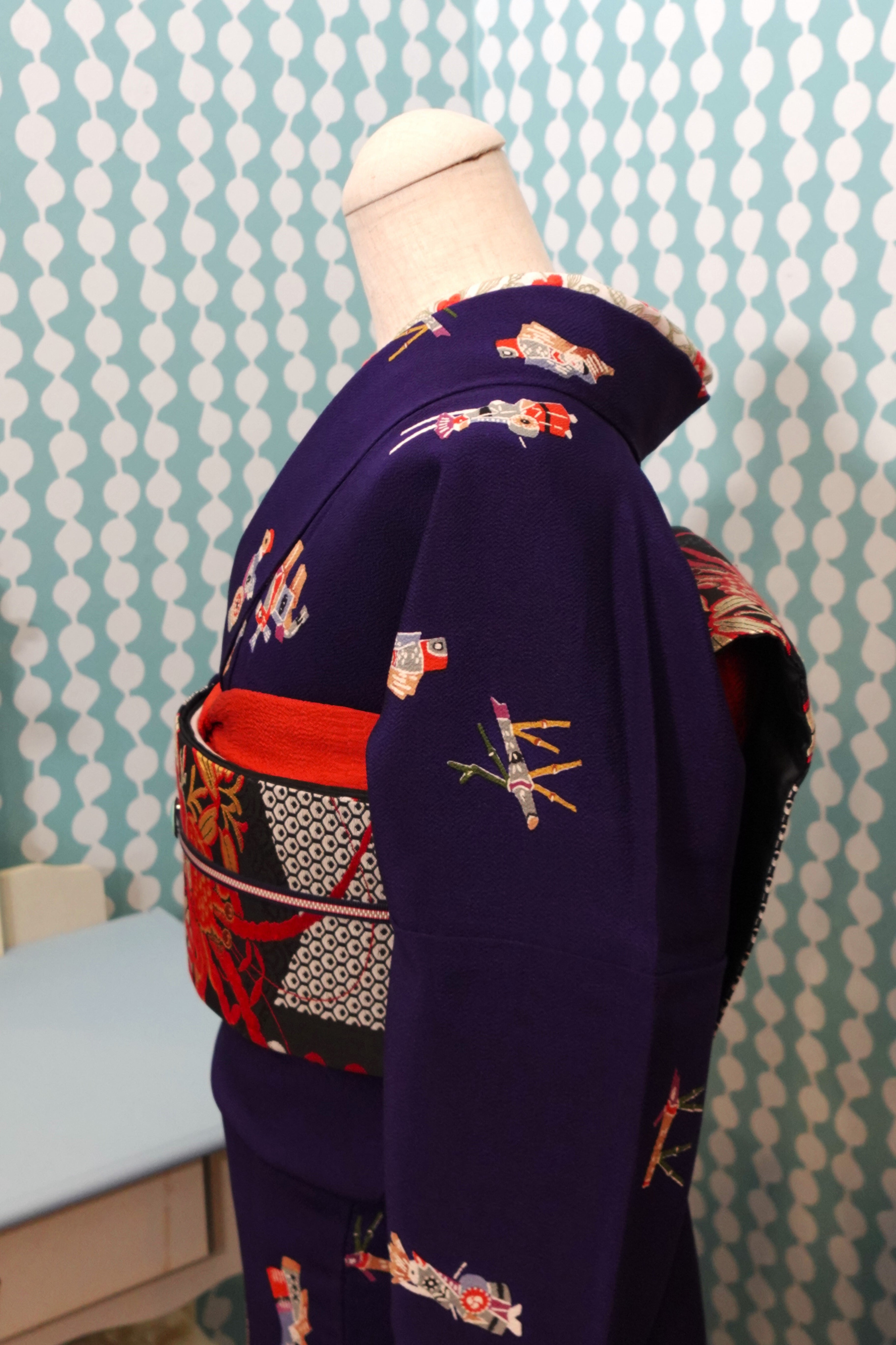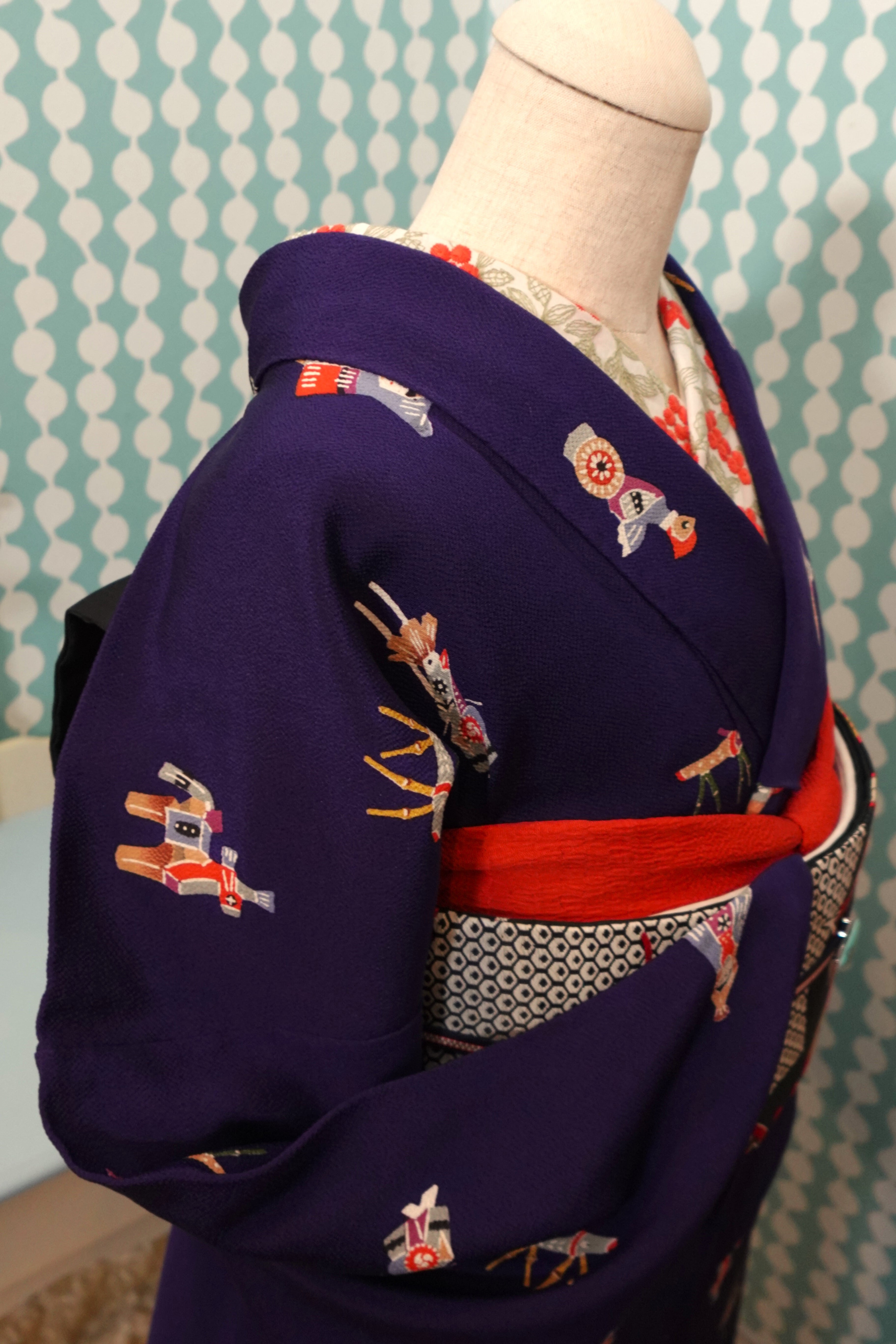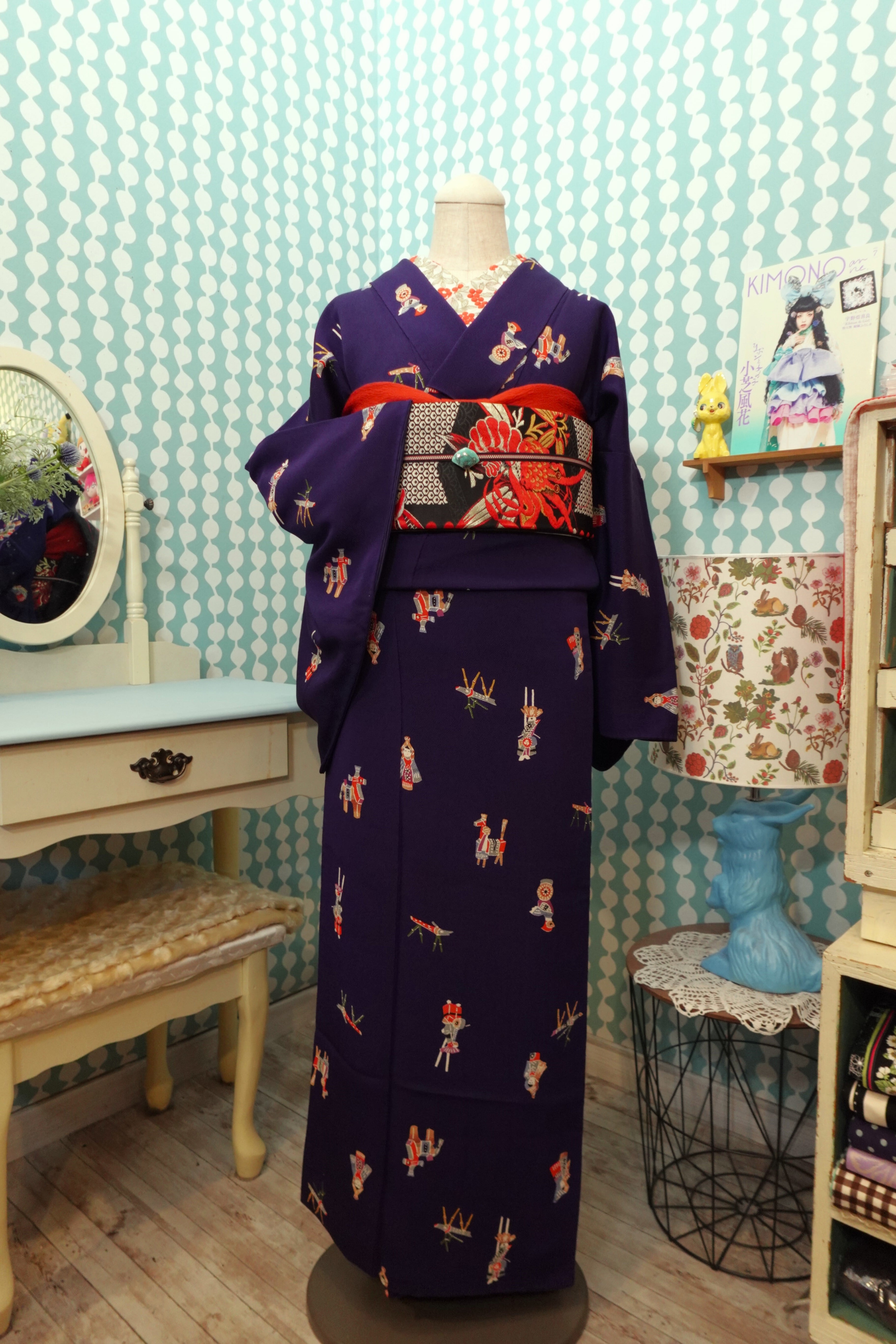 【身丈169cm】茄子紺に郷土玩具柄袷着物【小紋・裄丈長め】