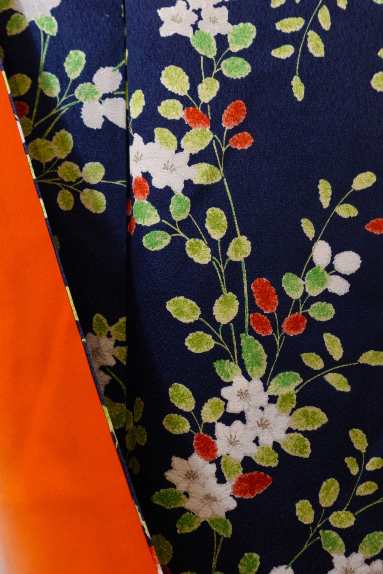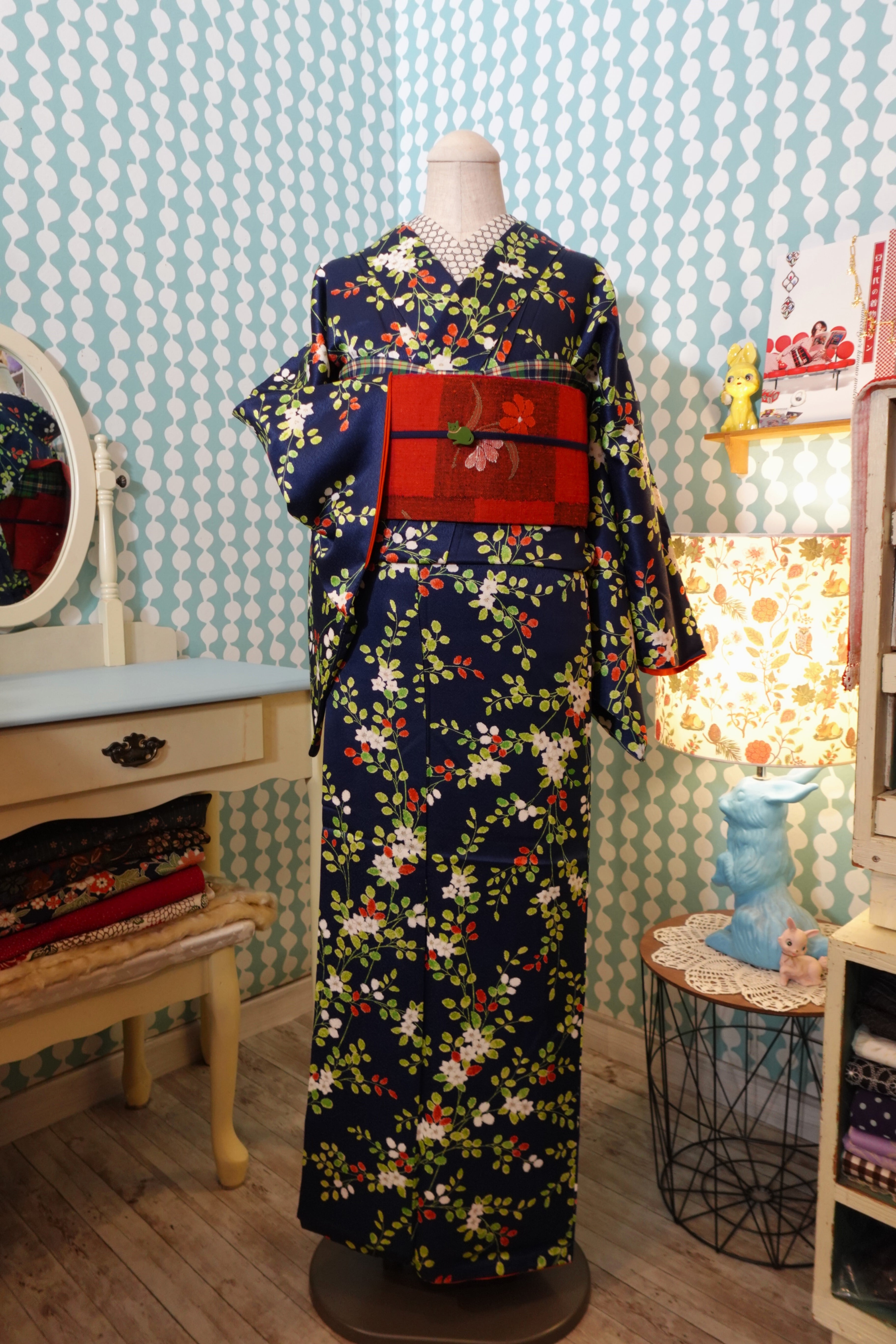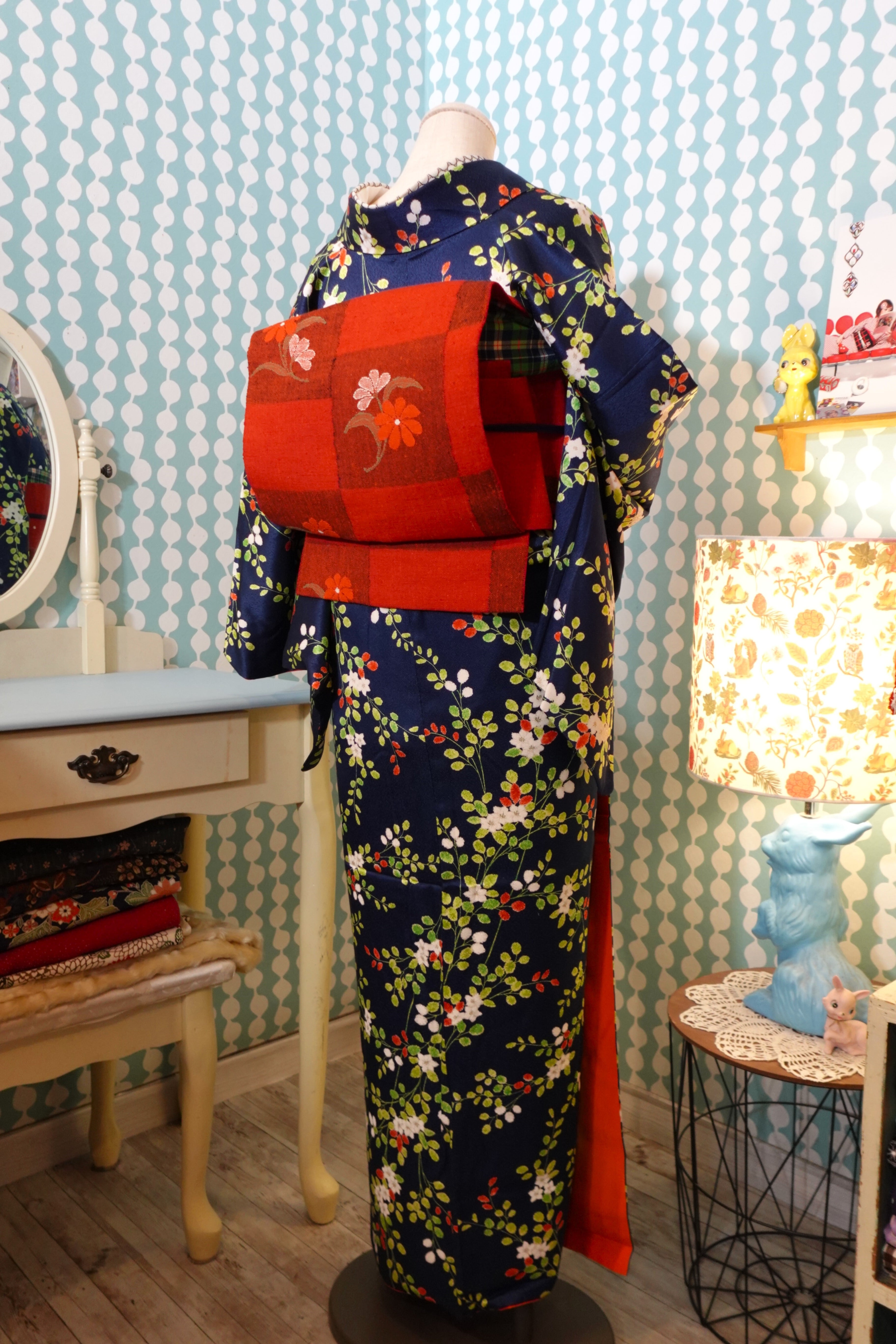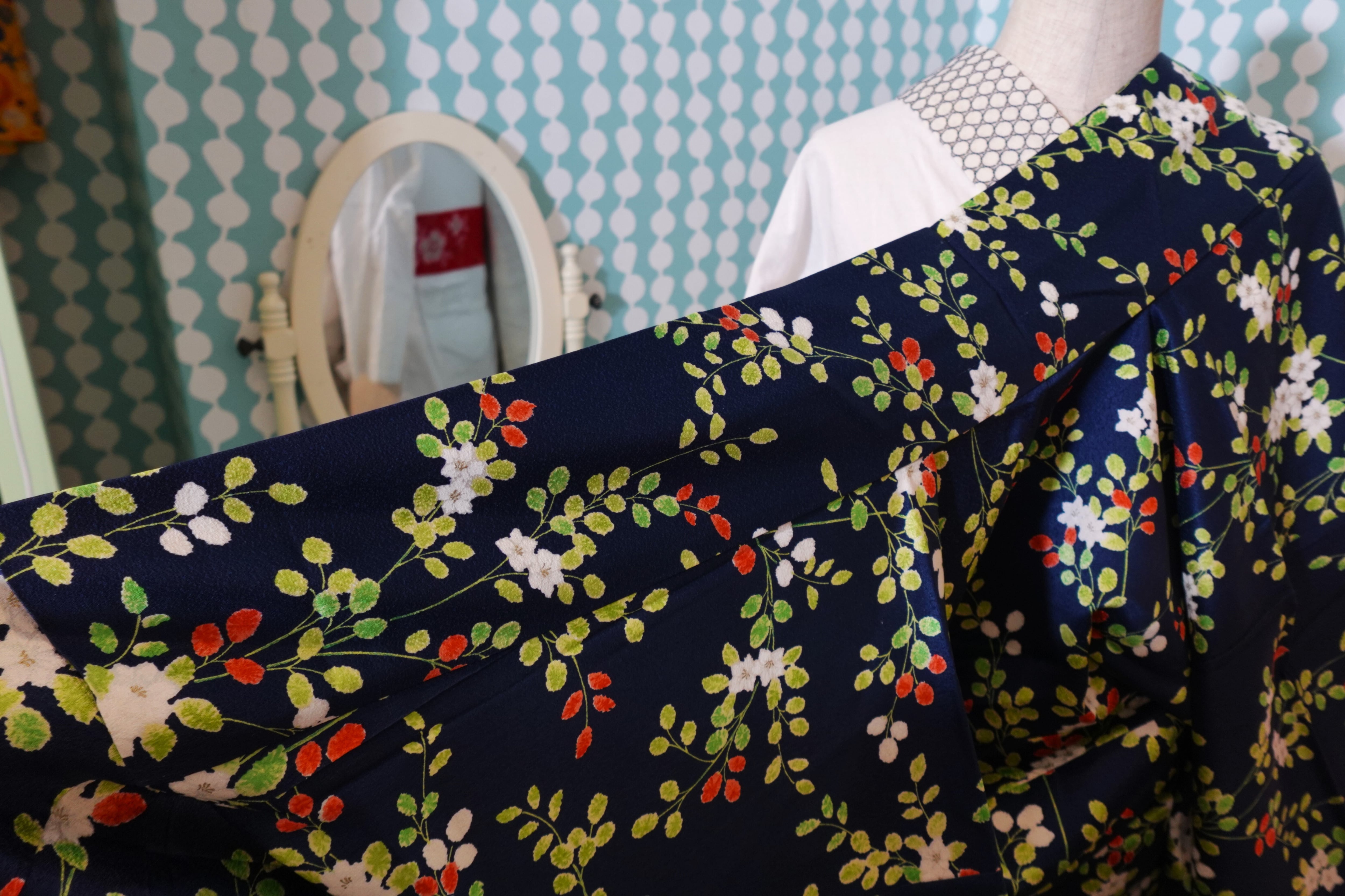 【身丈161cm】艶々紺地に桜とチェリーの袷着物【小紋】