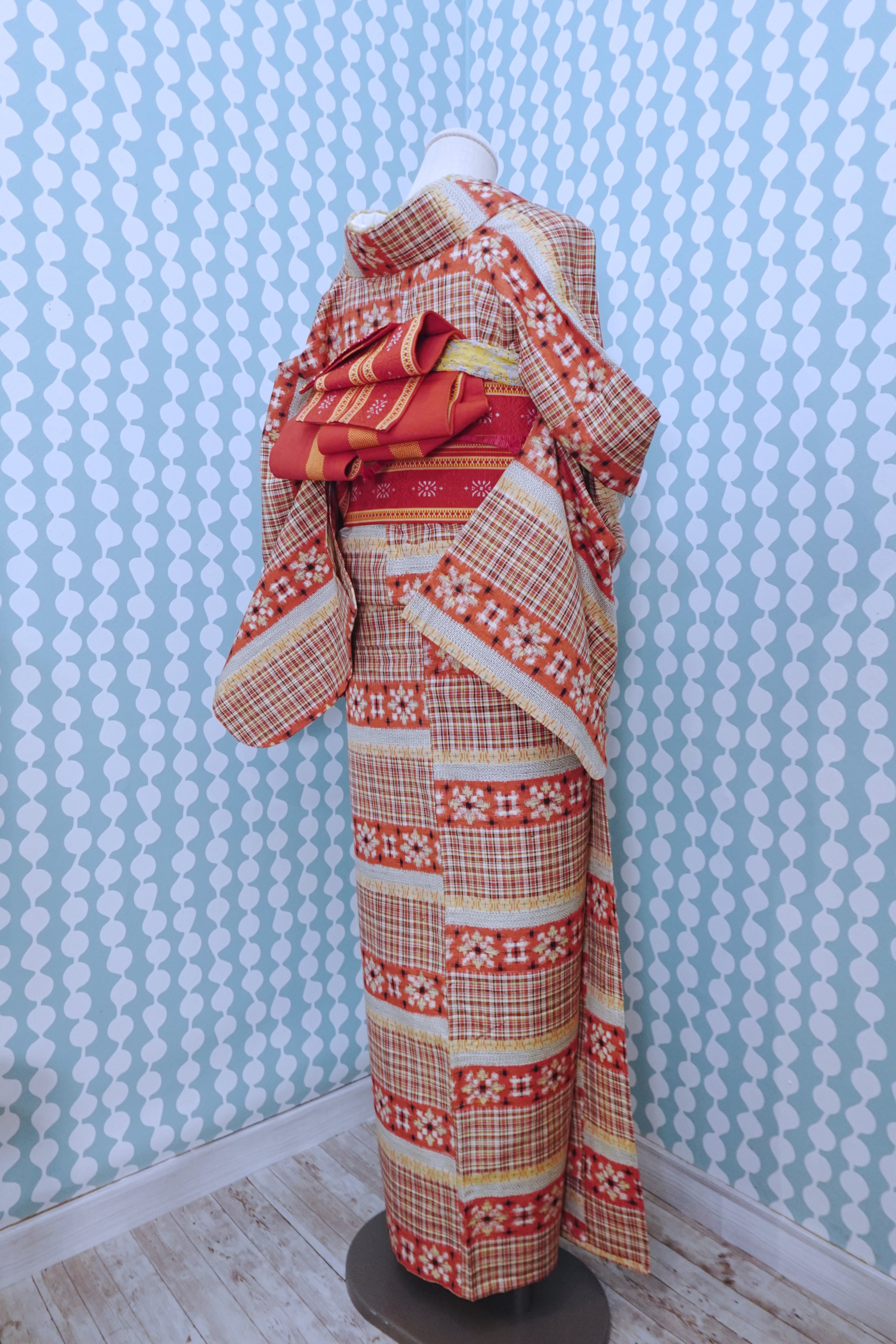 【身丈161cm】レトロなお花とチェックの紬単衣着物【小紋】